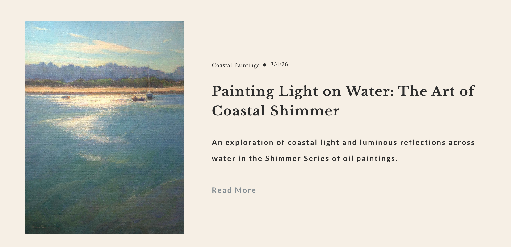 Through her signature Shimmer Series, she captures the fleeting brilliance of coastal light — its glow across water, the shifting pulse of atmosphere, and the quiet poetry of shoreline life.