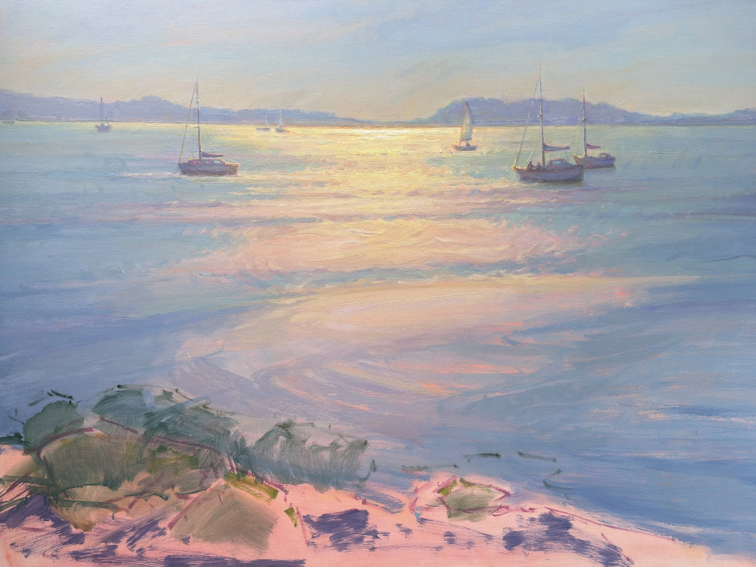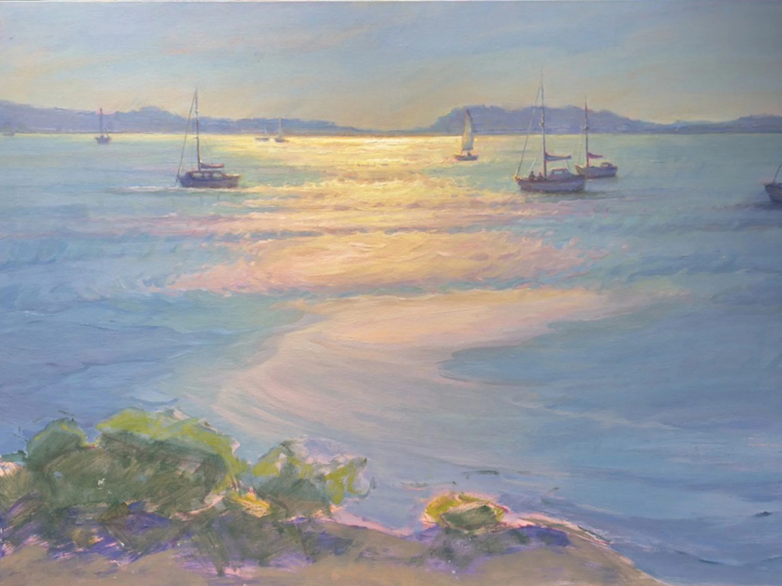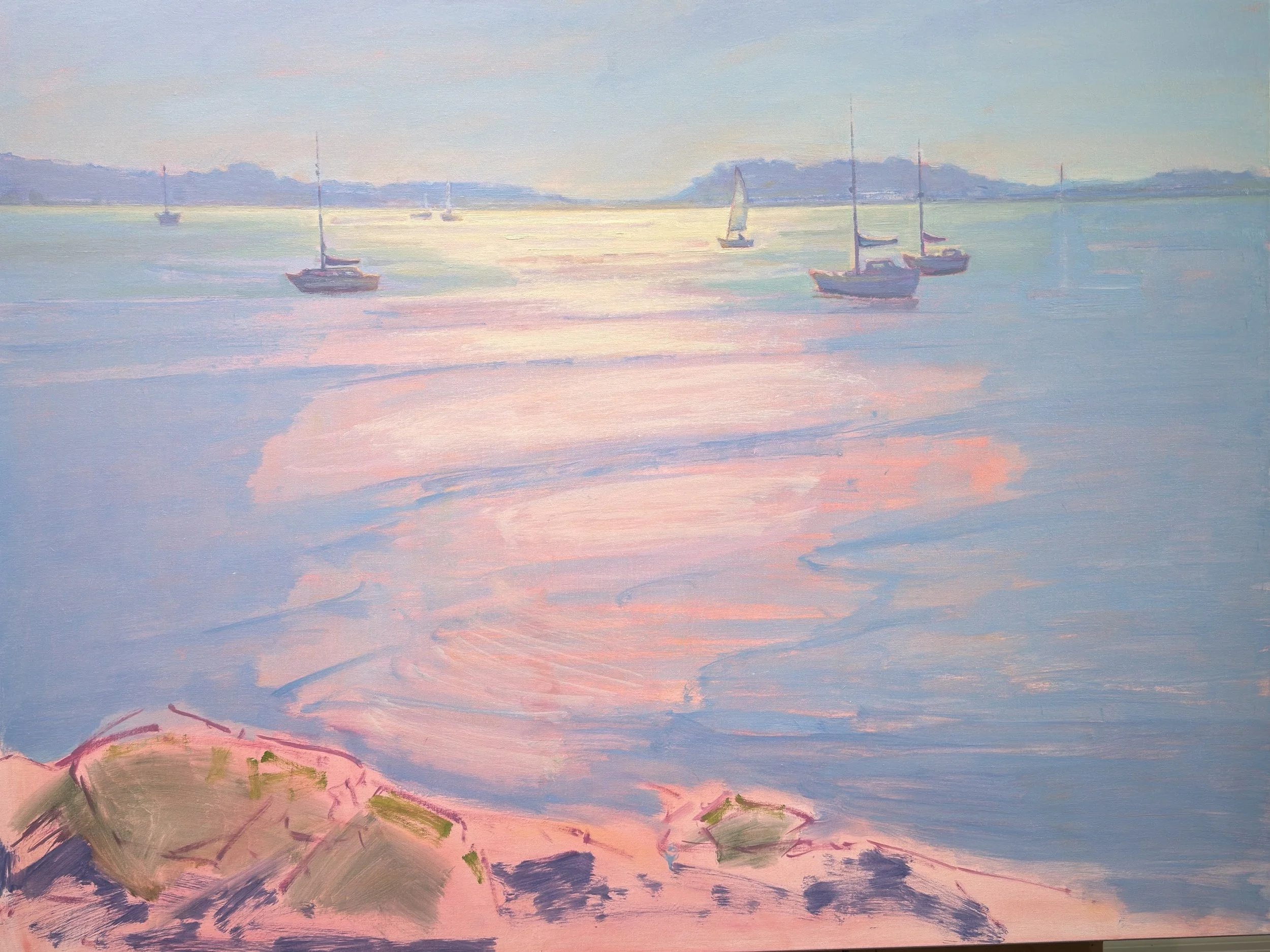 Each painting begins with a warm underpainting — a soft salmon tone that gives the canvas a gentle glow. From there, I layer varying hues and tones to build the play of light. My brushwork shifts between bold, energetic marks to suggest sparkle and softer passages that capture calm and atmosphere.